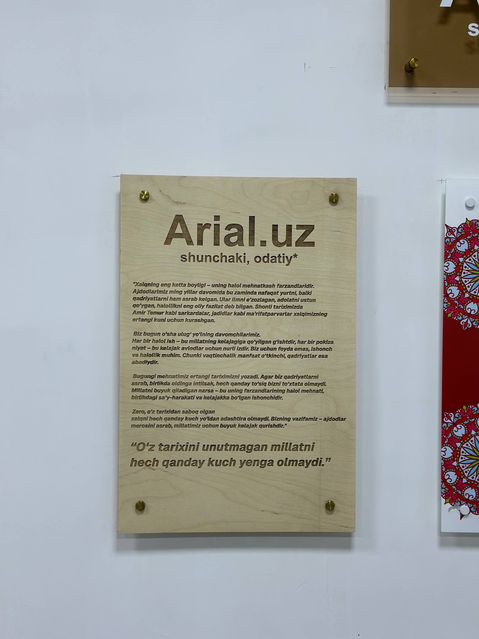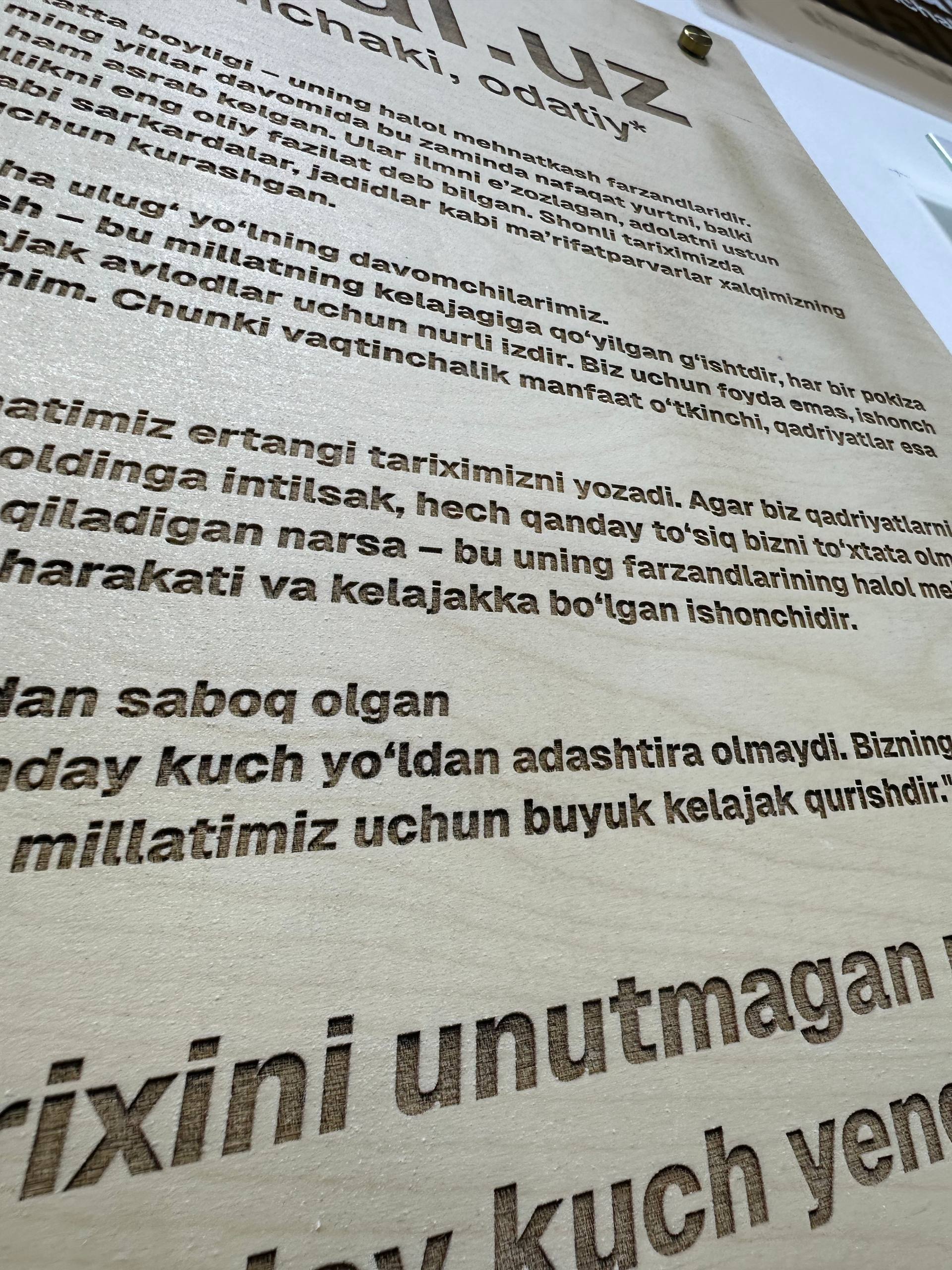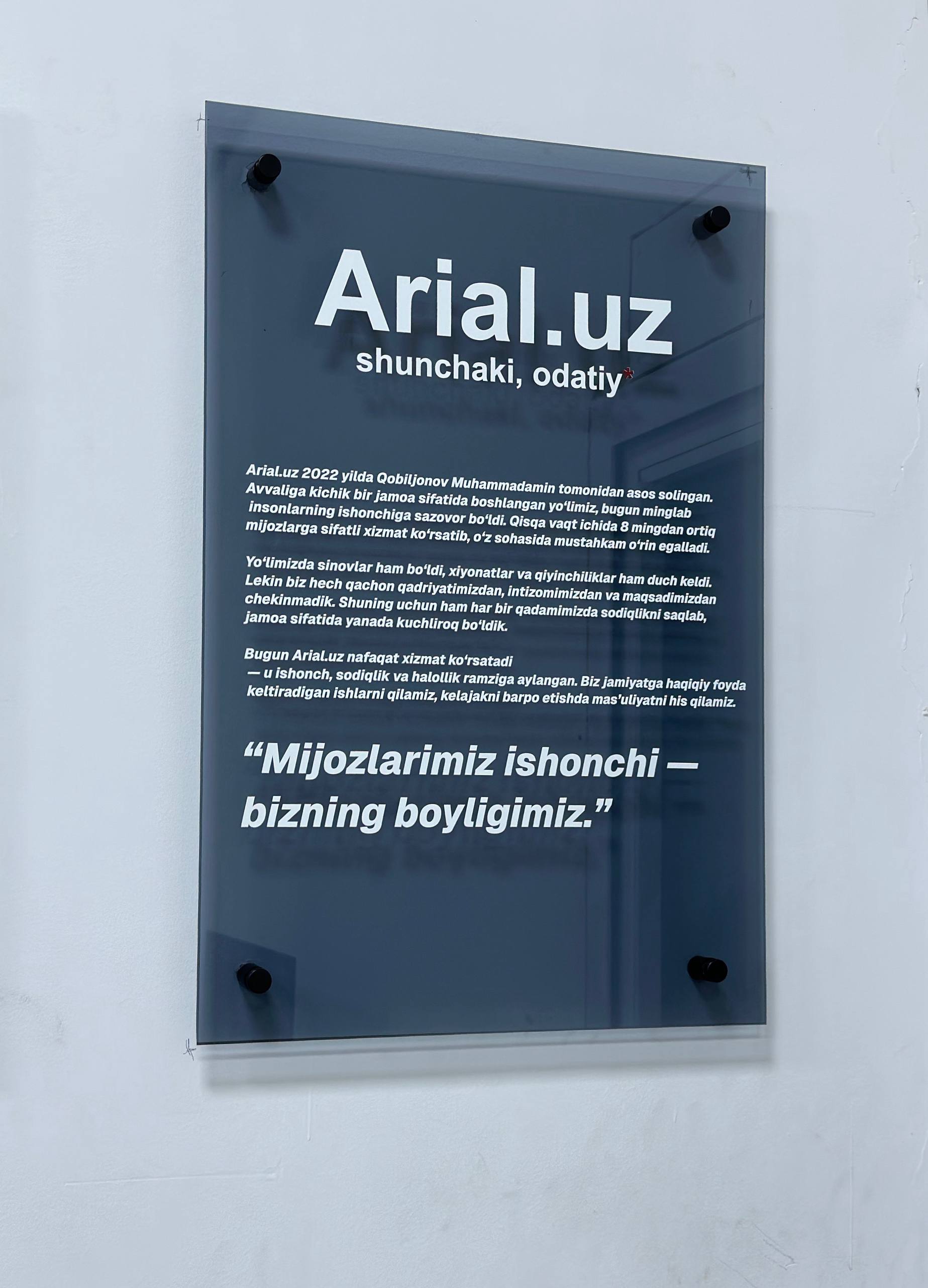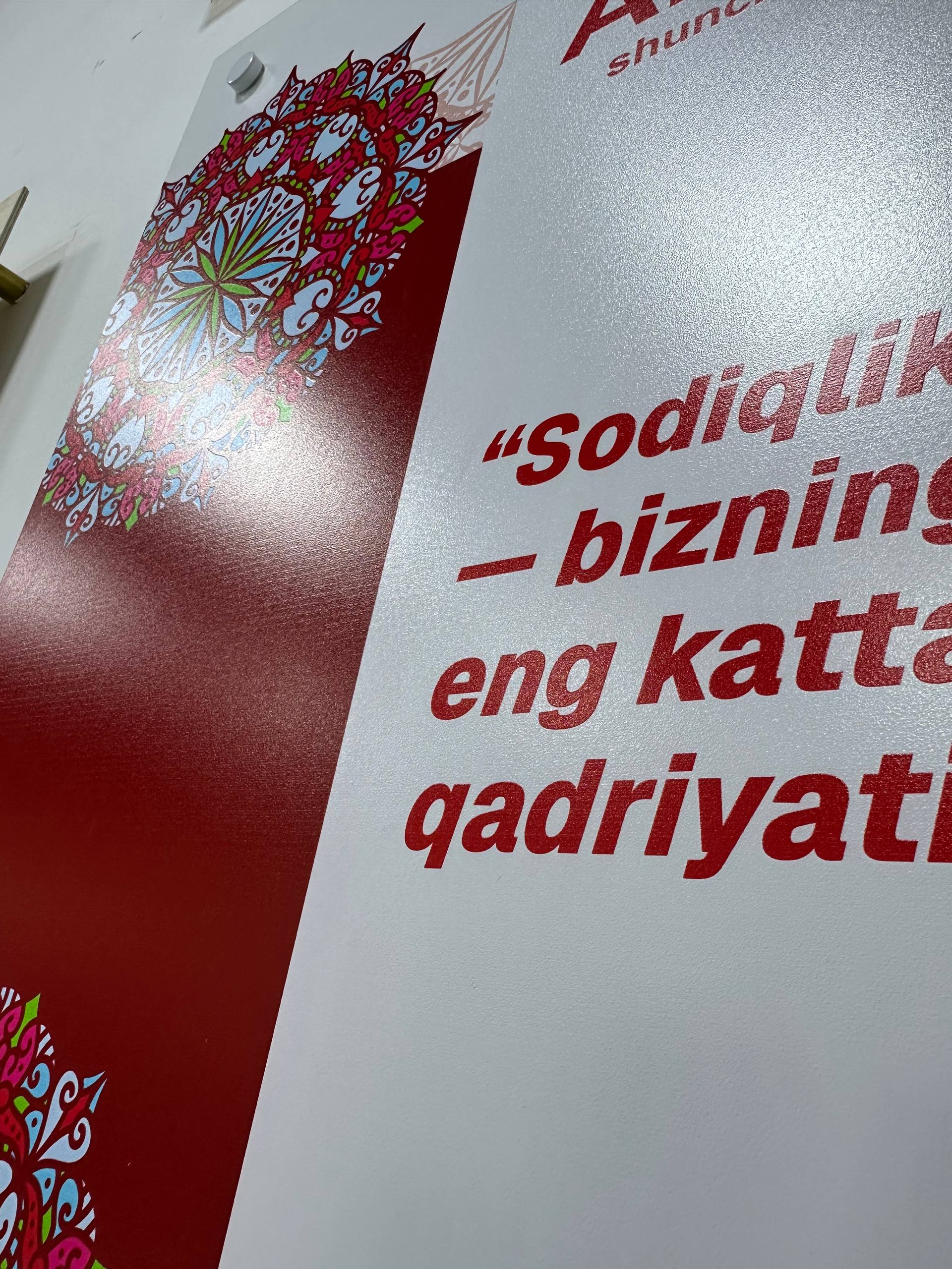 Bizning posterlarimiz – nafaqat bezak, balki qadriyatlaringizni ifoda etuvchi kuchli vositadir. Har bir posterning hajmi 60x40 sm bo‘lib, devordan 3 sm uzoqlikda maxsus boltlar orqali ushlab turiladi. Barcha turlari UV texnologiyasida pechat qilinadi va istak bo‘yicha ustanovka xizmati ham taqdim etiladi (alohida to‘lov evaziga).